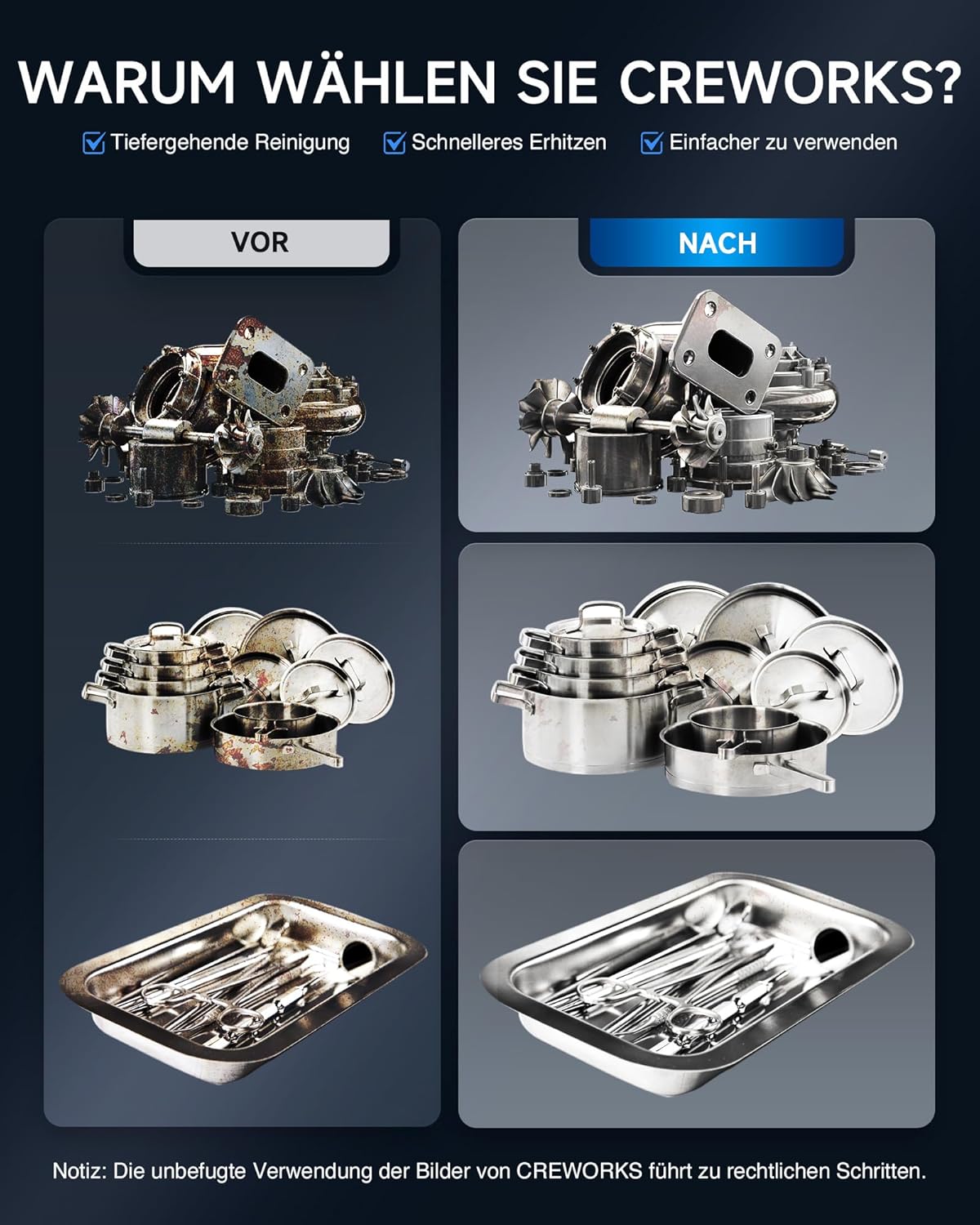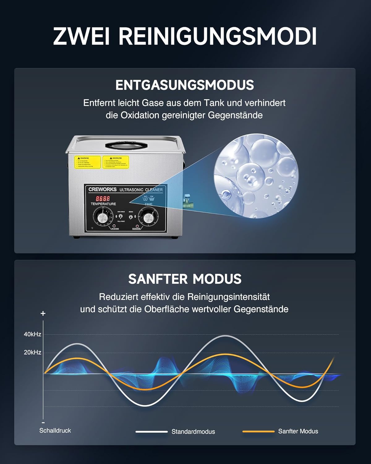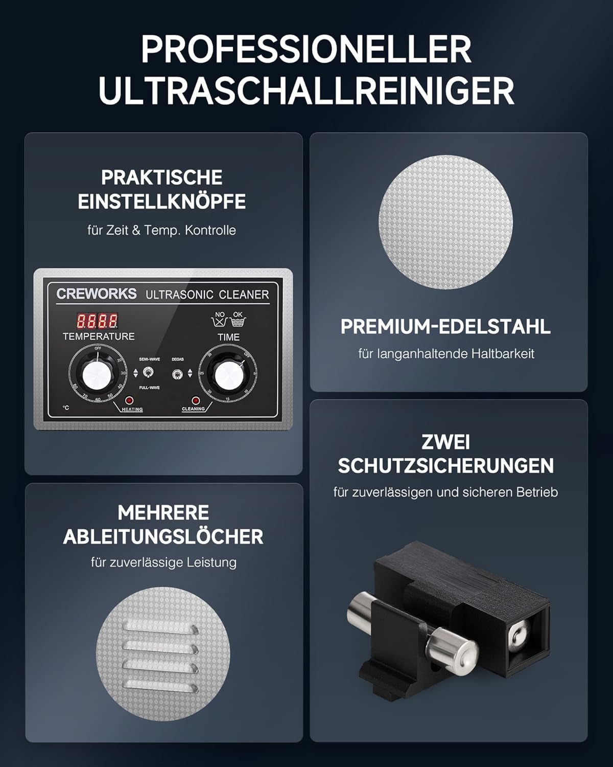 • 15L Ultraschallreinigungsgerät: Dieses 15-Liter-Ultraschallreinigungsgerät von CREWORKS bietet 360W Leistung, eine Heizung, einen Timer sowie Kippschalter und Drehknöpfe für einfache Bedienung. Es reinigt sowohl schwere Auto- und Maschinenteile als auch empfindliche Zahnspangen und Prothesen und lässt sie wie neu aussehen